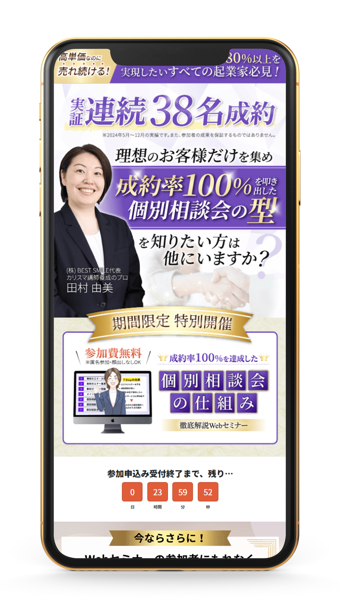 LPヘッダー画像(ウェビナー募集) 2025年3月28日 最終更新日時 : 2025年3月28日 k.yasuda8612@gmail.com LPヘッダー画像(ウェビナー募集) 案件の概要 無料のウェビナーをオファーするLPです。 ポイント 全部は読んでくれないので、「連続38名成約」や「成約率100%」「型」など、それだけを読めば概要が伝わる重要なキーワードが目立つように意識しました。