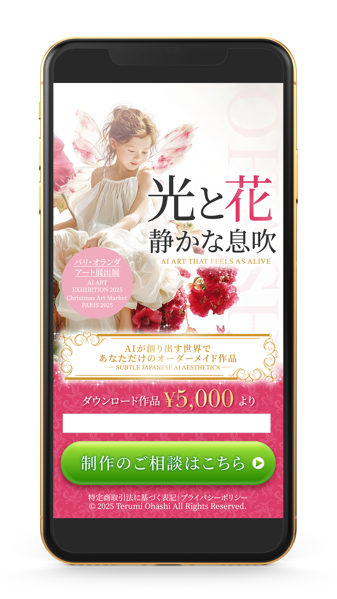 ひさびさのスマホ1画面LP制作。しかも、今回はAIクリエイターさんのサービスということで、その作品を全面に押し出すデザインを意識しました。コピーもセールスコピーよりイメージコピー!世界観や美術展のチケット風に仕上げた素敵な1枚です。